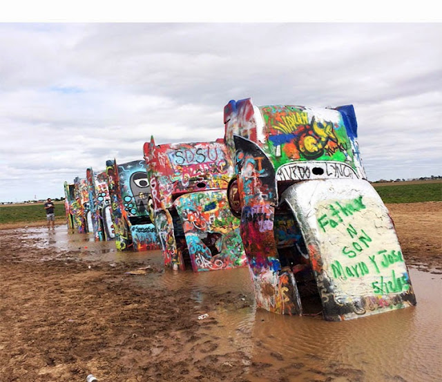 - A popular Route 66 stop near Amarillo, TX is "Cadillac Ranch." It was pretty strange. I guess it would be considered a public art installation. It was a few half-buried, old Cadillacs that were heavily covered in spray paint. You can spray paint on them and there are cans lying around everywhere. There was actually a bus of teenagers that came and sprayed on them.
